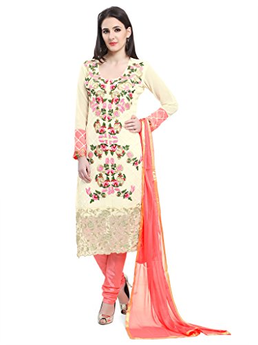 Ishin Poly Silk White & Peach Bollywood Embroidered Unstitched Dress Material