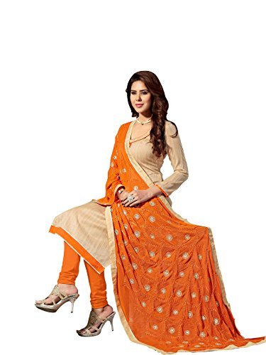 Buy from : Kanchnar Women's Beige and Orange Solid Unstitched Casual Wear Dress Material with Embroidered Orange Dupatta